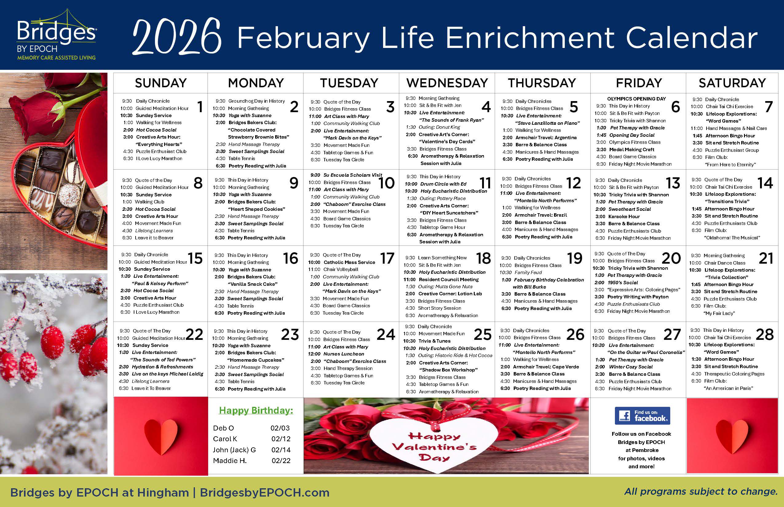 Bridges® by EPOCH at Hingham features three secure, residential households – Bare Cove, Cushing and Shipyard. Each household has private and companion suites, as well as its own inviting common spaces that look and feel like home.