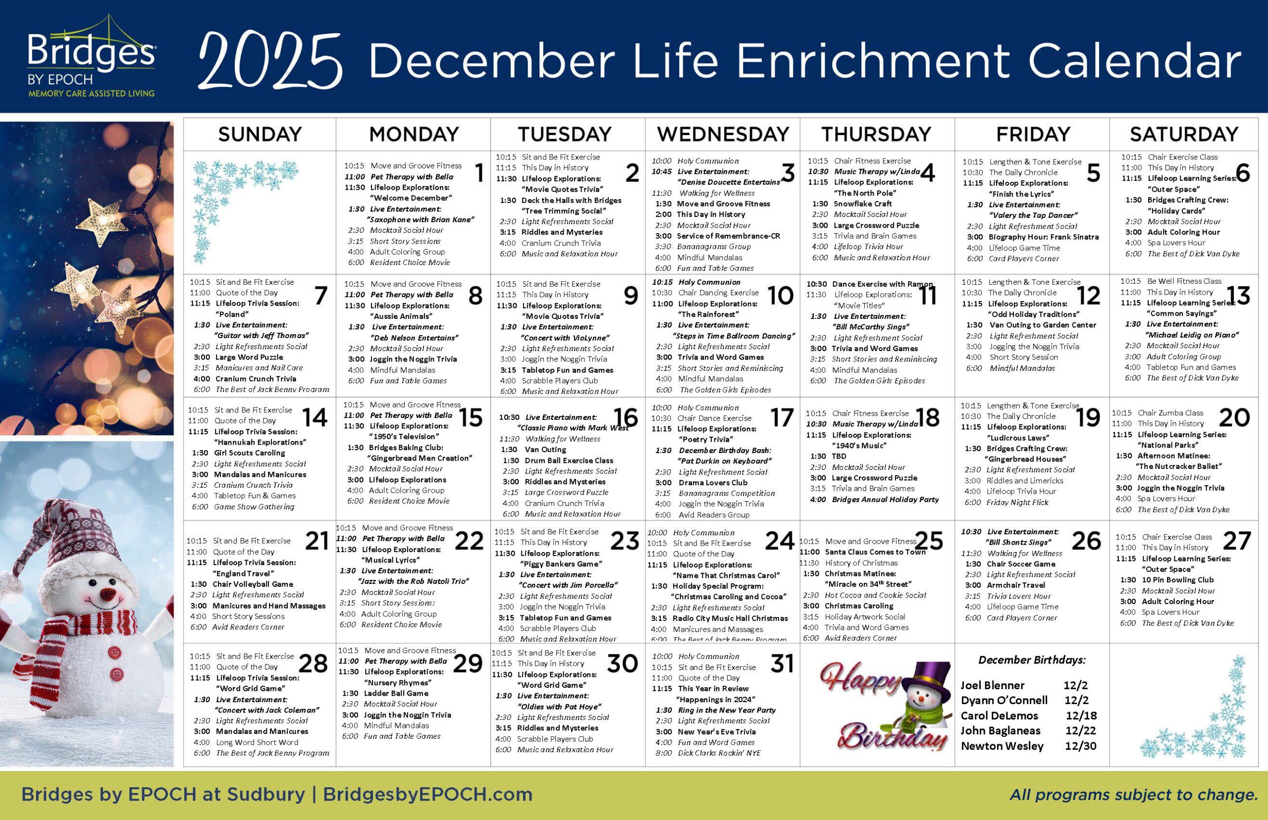 Our life enrichment team about Bridges® by EPOCH at Sudbury focuses on getting to know our residents personally – from their likes and dislikes to their passions and preferences. Using best practices to support those with memory loss, we focus on delivering a unique, person-centered experience that provides meaningful engagement and sparks joy in daily life. Our lifestyle is designed exclusively to support dignity and fulfillment for those living with Alzheimer’s disease and other forms of dementia.