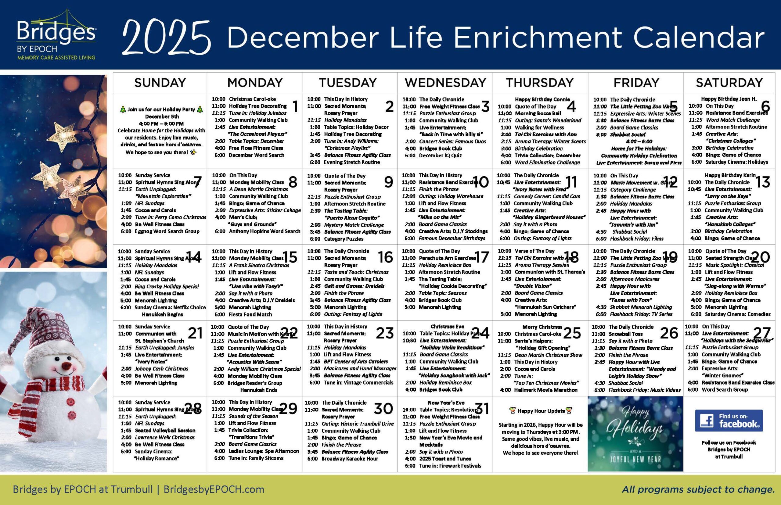 Through a highly personalized approach and engaging programs, the team at Bridges® by EPOCH at Trumbull provides the best care to our residents – promoting dignity and nurturing wellness through every stage of memory loss.